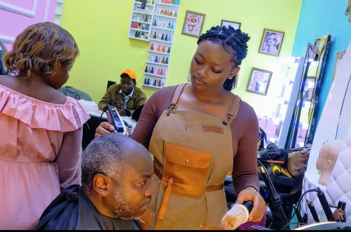 Gloria Mukelo, coiffeuse pour hommes, surprend les clients et les passants en exerçant un...